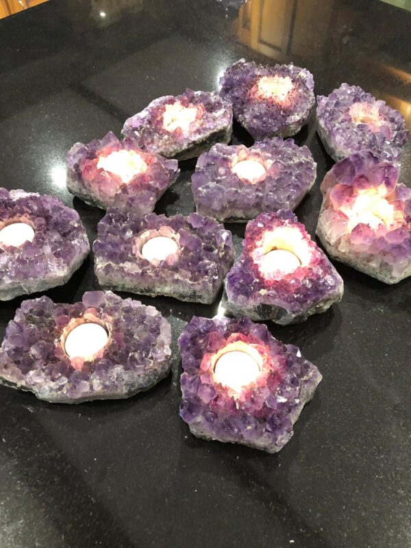 As covered in guides on pairing geodes with lighting, LED uplighting or spotlighting can create truly magical effects, particularly with amethyst’s purple crystals.