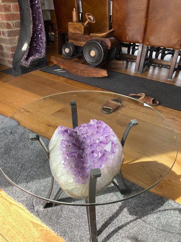 Pair with neutral furnishings to let the geode be the star, or work with complementary colours, deep purples with grey and silver, golden citrine with warm woods and brass accents.