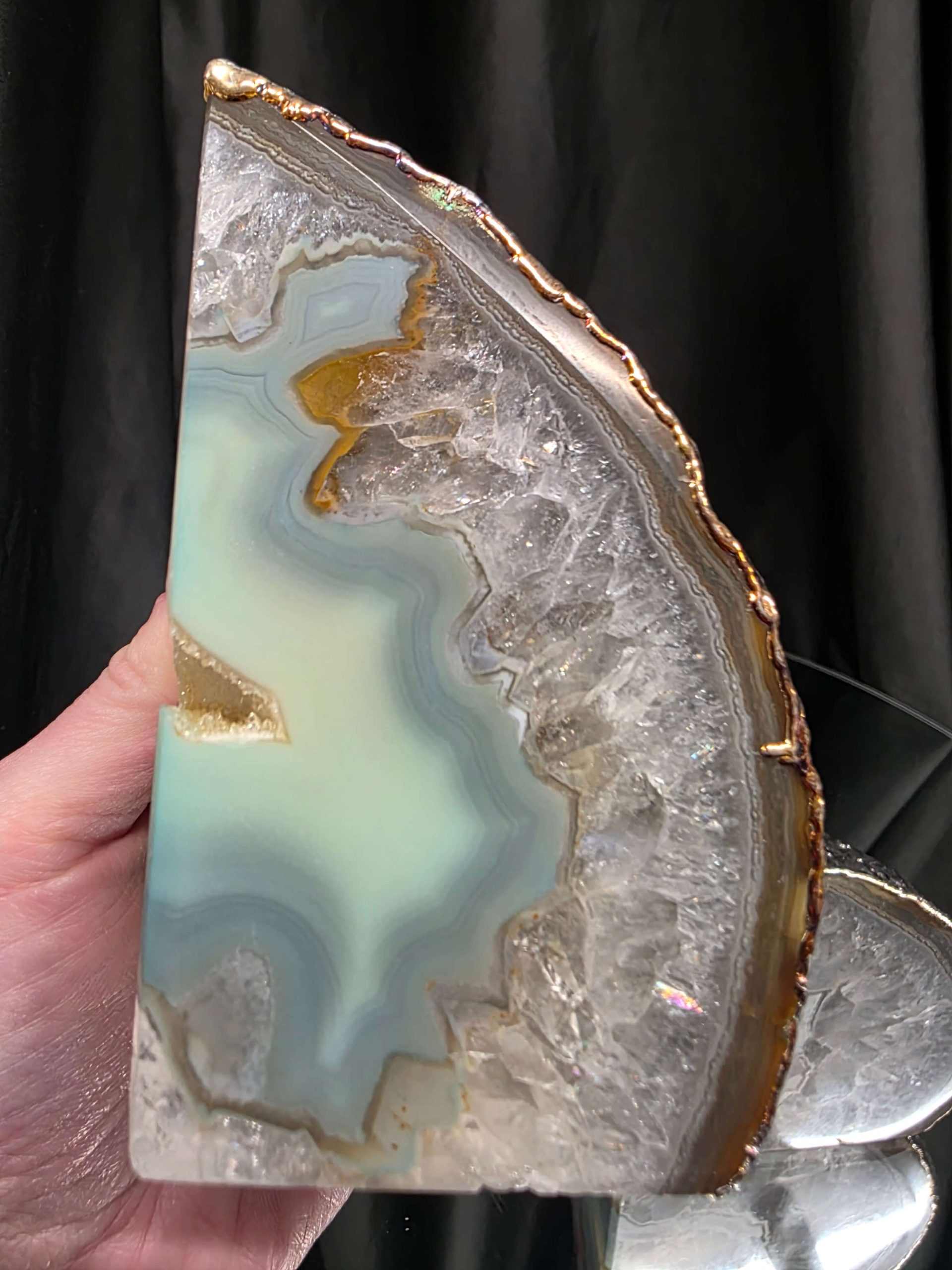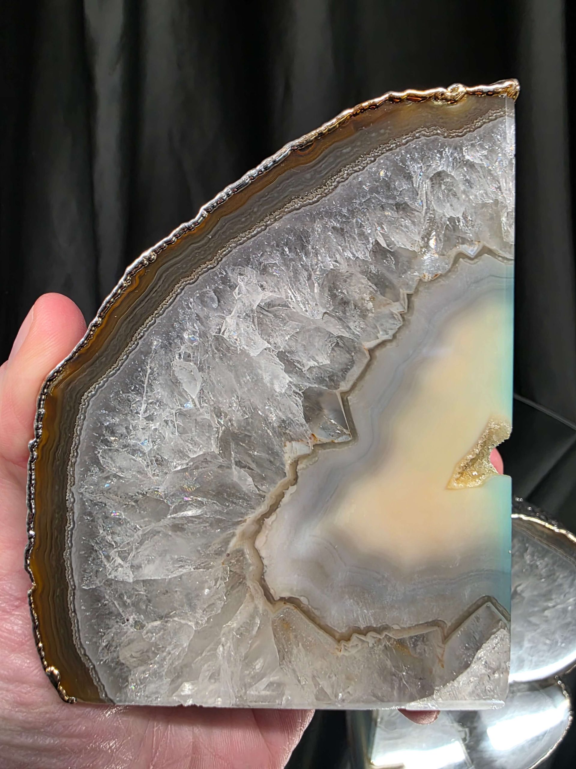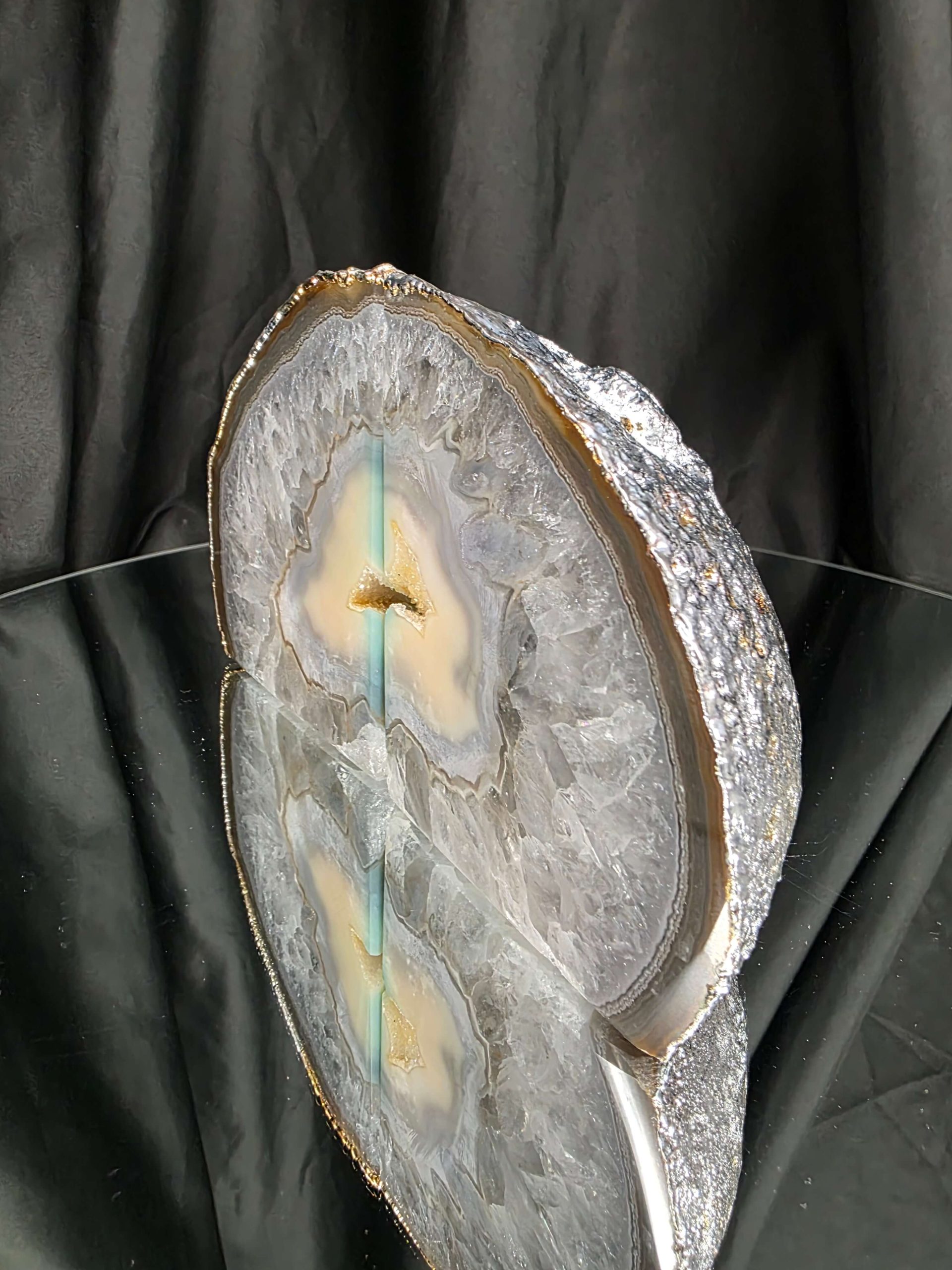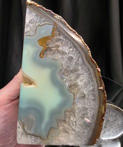 These bookends are with the gilded edge, this silver electroplated edge takes these agate bookends to a new dimension of beauty and sophistication. A true treat upon your surface which will make you smile each time you look at them. These pieces are very unique and a fantastic home accessory, also Brazilian agate is known for its calming powers and ability to cleanse its surrounding energy.