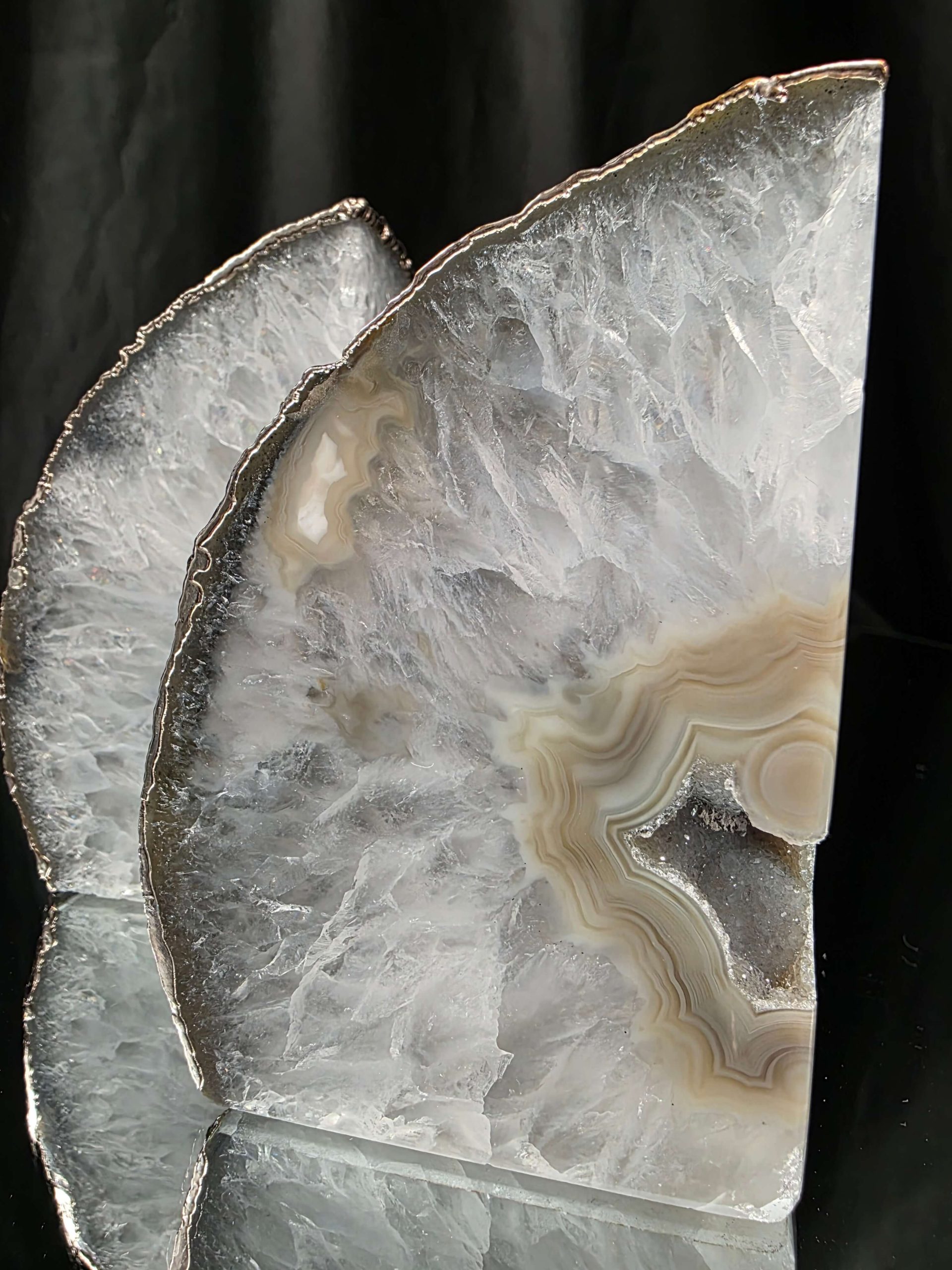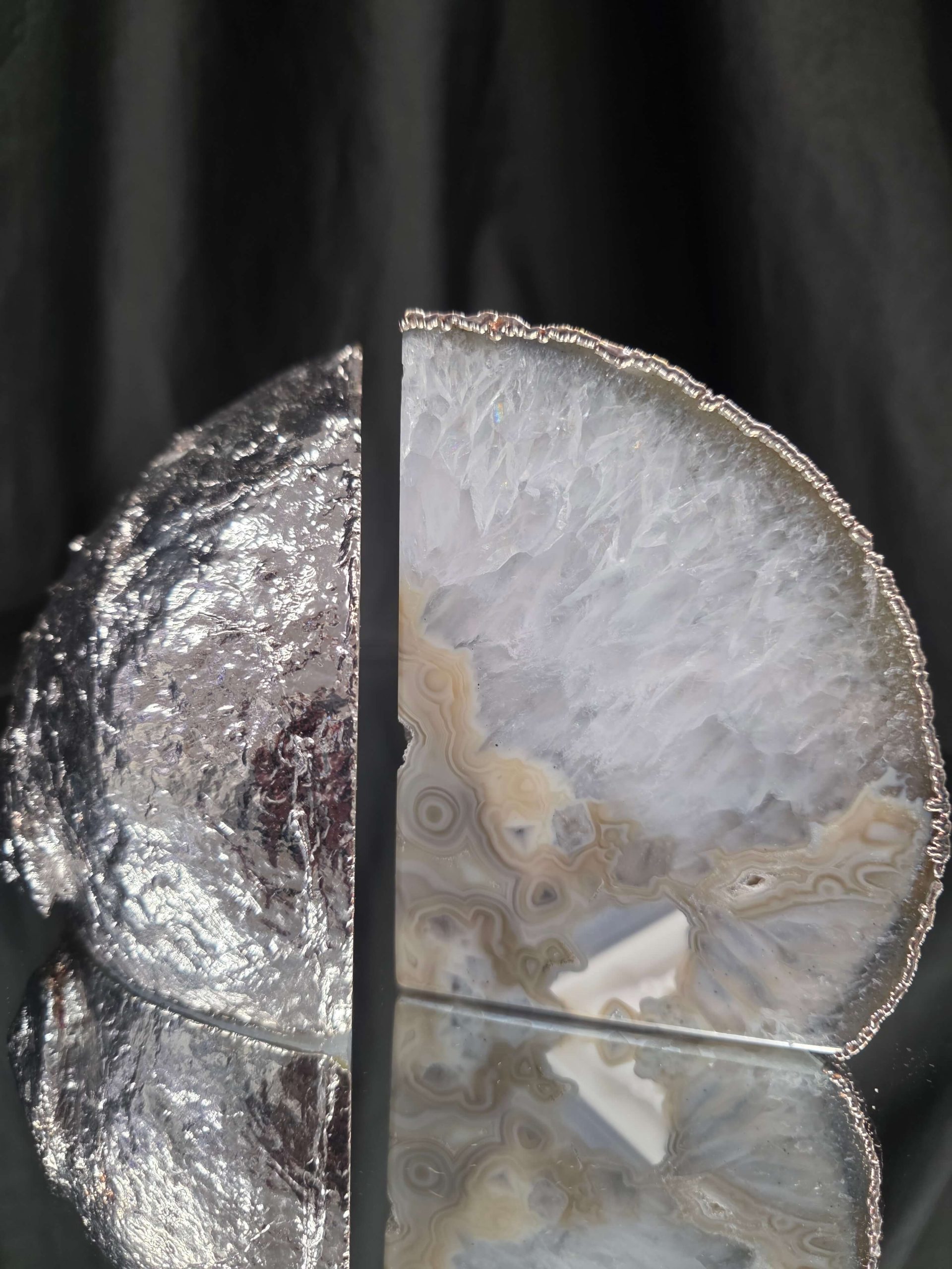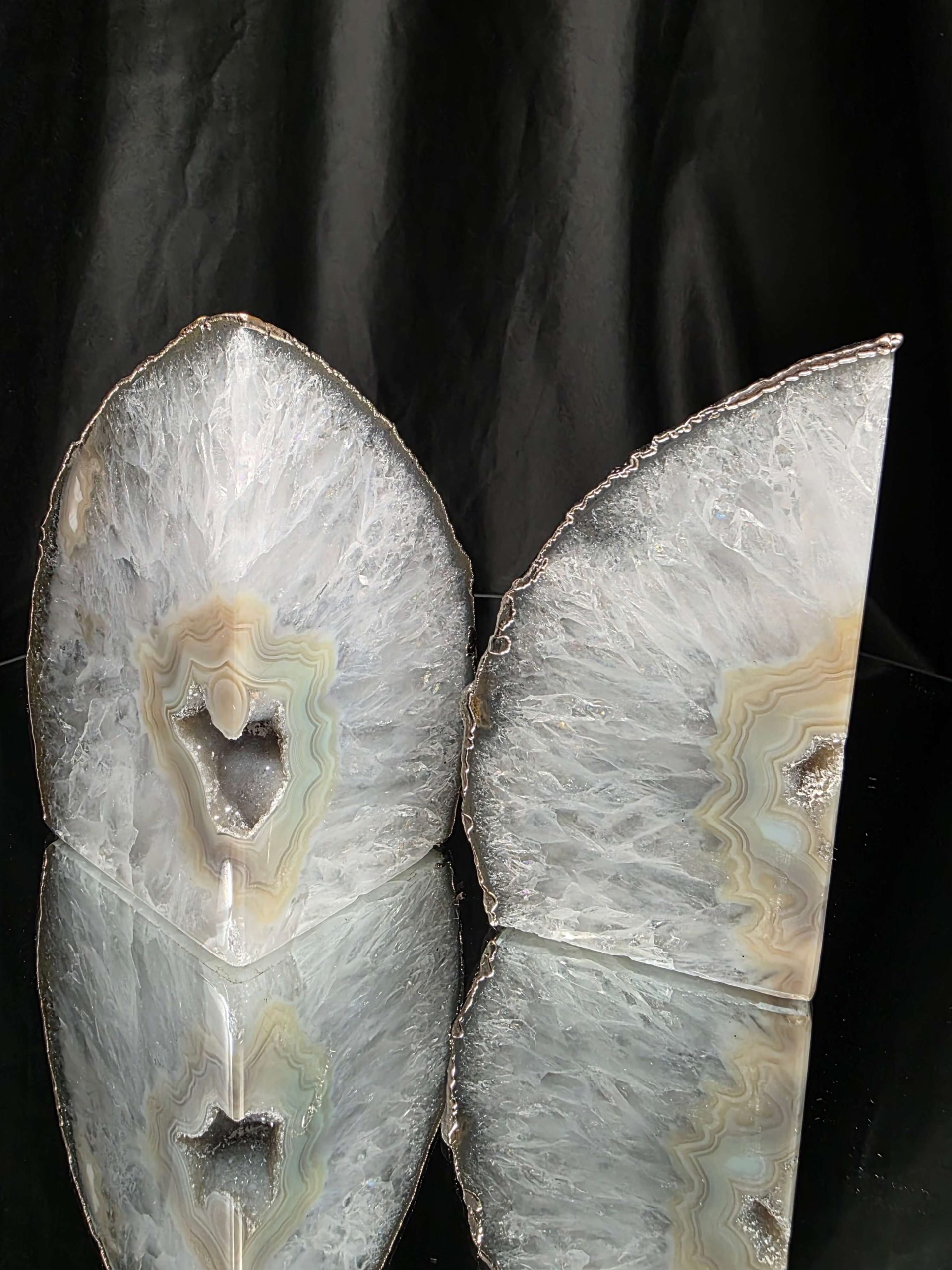 These bookends are with the gilded edge, this silver electroplated edge takes these agate bookends to a new dimension of beauty and sophistication. A true treat upon your surface which will make you smile each time you look at them. These pieces are very unique and a fantastic home accessory, also Brazilian agate is known for its calming powers and ability to cleanse its surrounding energy.